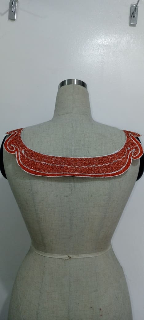 This bold embroidery piece commands attention with its rich burnt orange background and intricate white thread work. The design features expressive swirls, loops, and floral-like accents that form a harmonious flow across the panel. The sharp, pointed bottom and flourished shoulders enhance the piece’s regal structure, making it ideal for transforming simple garments into standout statement attire.