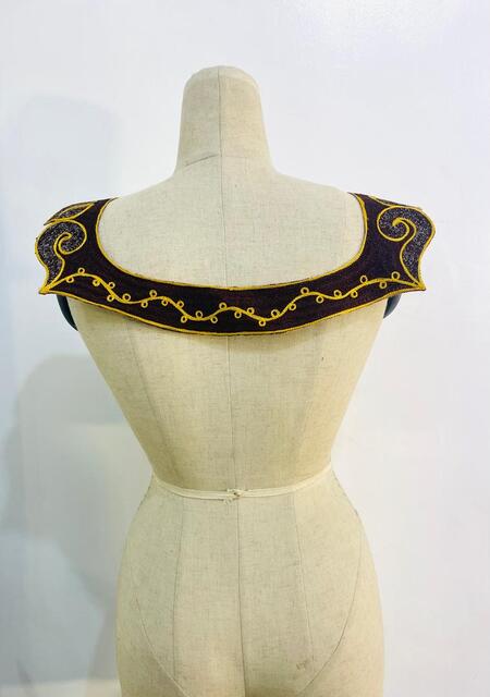 This is a luxurious embroidery piece that draws inspiration from classical botanical scrollwork and vintage filigree. The rich espresso brown backdrop, detailed with a white speckled texture, provides a deep and grounded canvas that lets the embroidery shine with a regal presence. Flowing through the design are elegant mustard gold vines, floral buds, and curled fern-like motifs, arranged in symmetrical harmony.