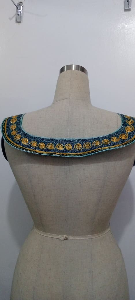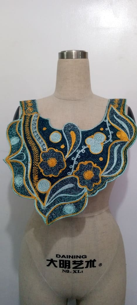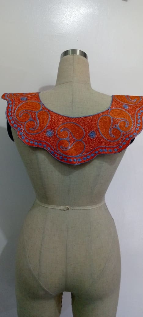 Infuse your designs with a striking blend of color and craftsmanship with this vibrant orange and blue embroidered collar appliqué. Featuring an intricate swirling motif, delicate embellishments, and shimmering details, this piece adds a bold and regal touch to kaftans, gowns, and traditional wear. The rich texture and elegant contrast make it perfect for statement fashion pieces and luxury embellishments.