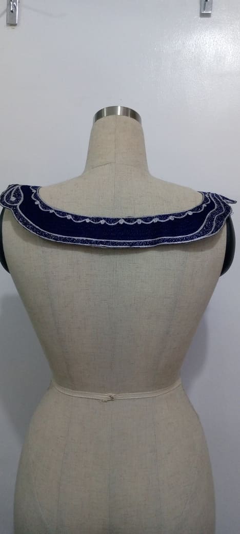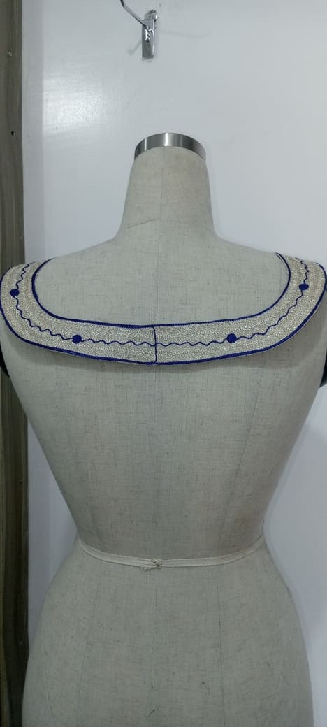 The Royal Waves Embroidery Yoke is a striking decorative garment piece, designed to be the centrepiece of a blouse or dress. This embroidery features a rich, deep royal blue base that exudes elegance and sophistication. Intricate white and silver thread work dances across the fabric in a symmetrical pattern, creating fluid, wave-like motifs and floral accents that suggest both movement and grace.