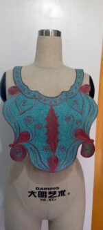 Elevate your designs with this exquisite RED AND blue embroidered collar appliqué. Crafted with precision, it features intricate thread work on a shimmering lavender-toned mesh, creating a striking contrast. The symmetrical floral and bow-inspired patterns add a touch of regal charm, making it perfect for enhancing kaftans, blouses, or couture dresses.