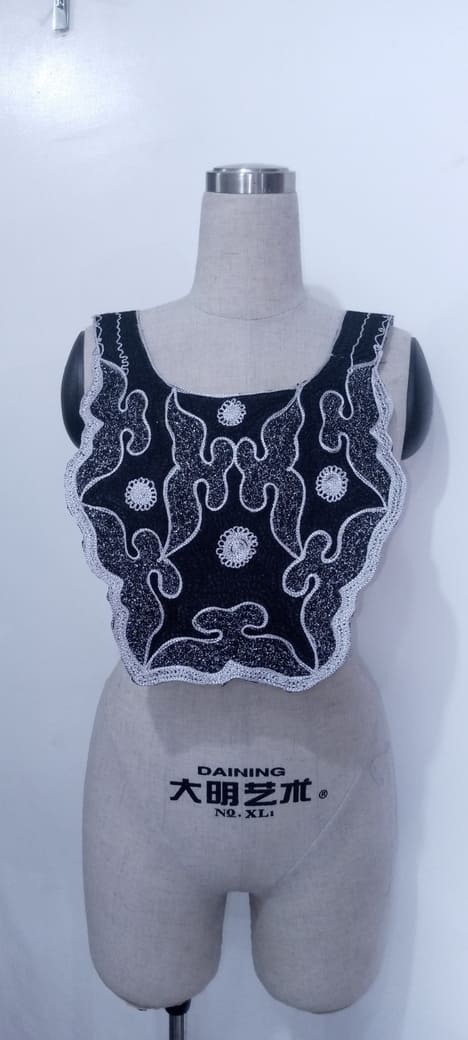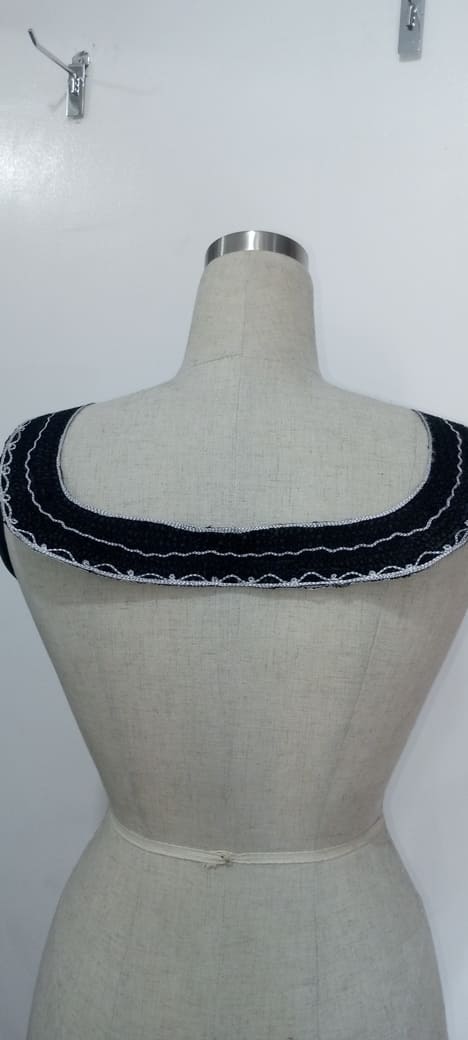 Elevate your designs with this sophisticated black and white embroidered collar appliqué. Featuring a graceful leaf-inspired motif outlined in rich white thread, this piece exudes luxury and refinement. The shimmering accents on the black fabric add depth and elegance, making it an ideal embellishment for kaftans, gowns, and formal wear. Designed to make a bold statement, this appliqué is perfect for fashion-forward creations that demand attention.