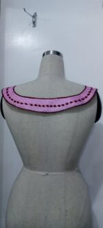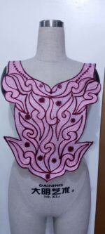 Crimson Pick Neck Embroidery is a striking piece of embroidery that evokes the vivid imagery of blooming petals entwined with dancing flames. Set on a soft pink base, rich crimson thread outlines an intricate pattern of swirling vines and flame-like curves, creating a dynamic sense of movement and elegance. The central design resembles both floral motifs and stylized fire, blending femininity with fierce energy.