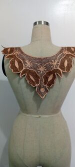 Make a bold statement with this exquisite bronze embroidered collar appliqué. Featuring a rich blend of shimmering metallic threads and intricate floral motifs, this design exudes timeless elegance. The scalloped edges and symmetrical leaf-like patterns add a touch of sophistication, perfect for elevating kaftans, gowns, and couture pieces. The sparkling embellishments make it ideal for special occasions and luxury fashion projects.