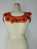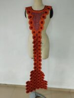 The ember Scales is a bold and sculptural embroidery piece featuring a rhythmic cascade of fiery orange-red circular motifs, reminiscent of dragon scales or the tail of a mythic sea creature. Each circular unit is meticulously crafted with a dense, radiant embroidery that draws the eye down the garment, creating a strong vertical line that accentuates the figure and evokes movement.
