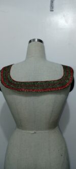 This piece features a rich, earthy palette dominated by deep forest green, symbolizing nature and growth, beautifully contrasted with vibrant crimson red accents that evoke blooming flowers. The symmetrical floral and geometric motifs are intricately embroidered, creating a striking interplay between bold structure and organic softness.