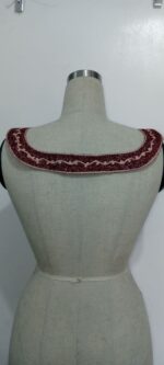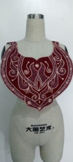 This is a bold, heart-shaped embroidery chest piece that commands attention with its deep red base and intricate ivory thread work. Designed with sweeping curves, symmetrical motifs, and fine ornamental flourishes, the embroidery resembles a fusion of floral vines and regal emblems.