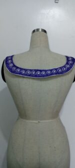 This embroidery base is dominated by a deep, elegant indigo blue colour, intricately overlaid with silver-white thread work in a layered, wave-like pattern. The design flows in symmetrical, cresting arches from the neckline downward, creating a bold and dynamic visual rhythm.