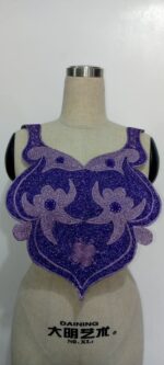 This embroidery is a captivating piece defined by its opulent purple and lilac tones, radiating luxury and charm. The base features a rich, glitter-infused royal purple that glimmers with every movement, while the floral patterns are rendered in a soft, pastel lavender that adds grace and delicacy.