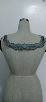 Set against a soft turquoise base, this unique piece features flowing, flame-like red embroidery that dances across the fabric in graceful, organic curves.