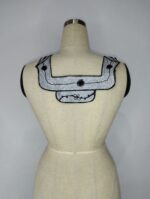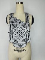 This is a striking embroidery piece that elegantly combines the timeless contrast of black and white. The design features bold, symmetrical patterns reminiscent of traditional lacework and geometric mandalas, intertwined with organic floral motifs. The white mesh fabric serves as a delicate canvas for the rich black embroidery, creating a visual rhythm that balances structure and fluidity.