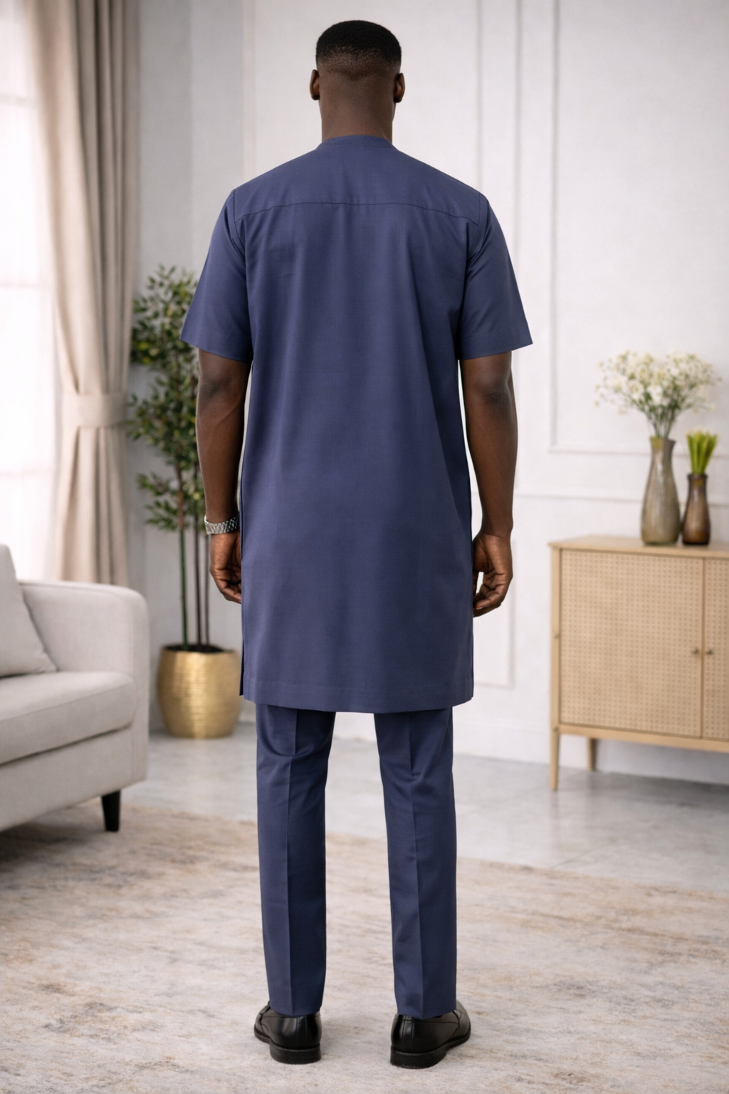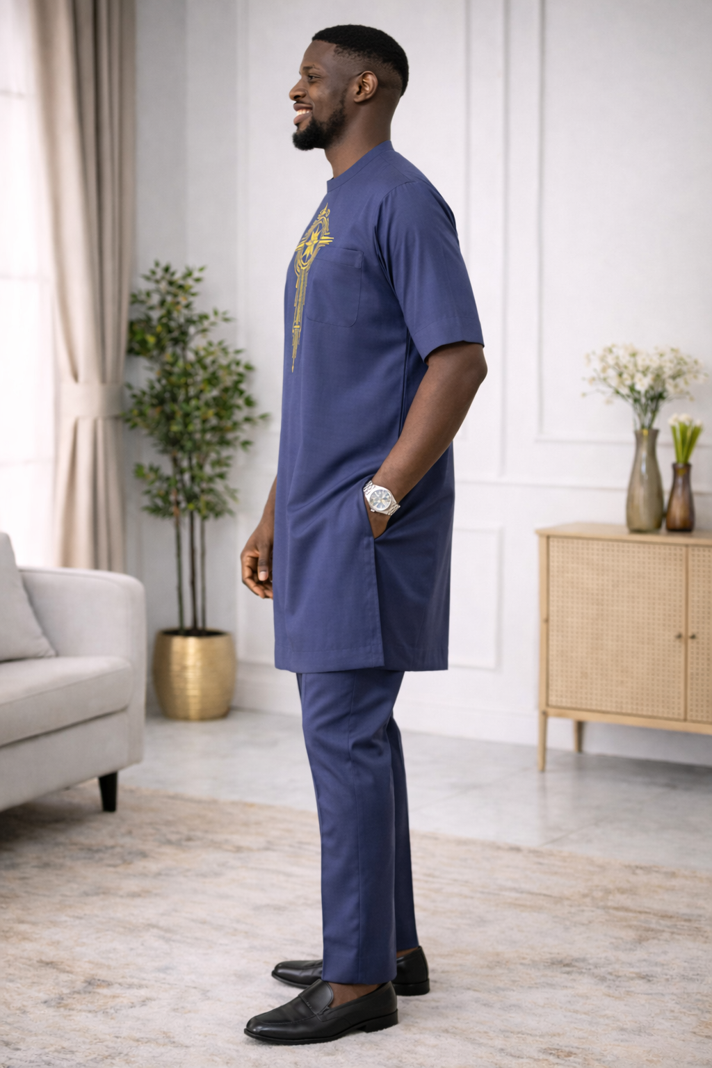 A refined, contemporary take on traditional menswear — a deep-blue kaftan set accented with intricate gold embroidery for effortless eleganceA refined, contemporary take on traditional menswear — a deep-blue kaftan set accented with intricate gold embroidery for effortless elegance