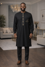 Black kaftan with gold and silver embroidery, chest pocket detail, and matching trousers.