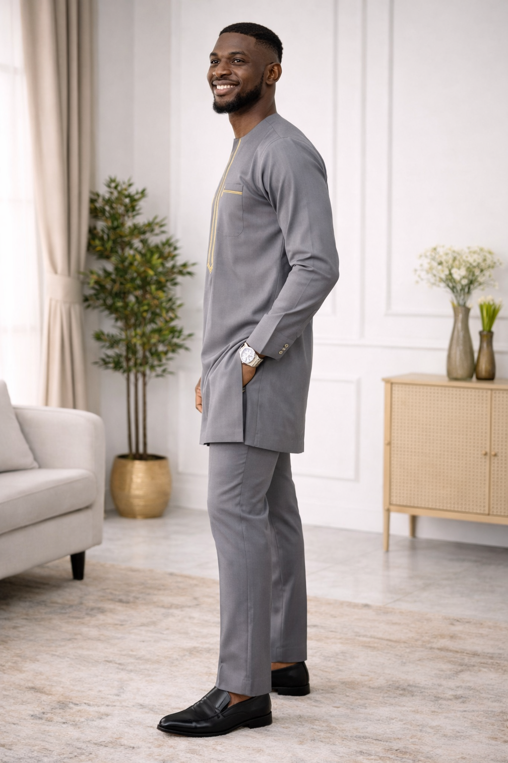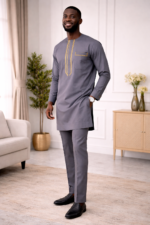 Refined and contemporary, this gray kaftan is tailored for elegance and versatility. The long-sleeved tunic features a round neckline and is accented with intricate yellow embroidery along the front placket and chest pocket, adding a vibrant touch of artistry to its clean silhouette. Paired with matching trousers, the ensemble offers a cohesive look that blends cultural tradition with modern sophistication. Perfect for formal gatherings, festive occasions, or stylish everyday wear, this piece is a timeless addition to any wardrobe.