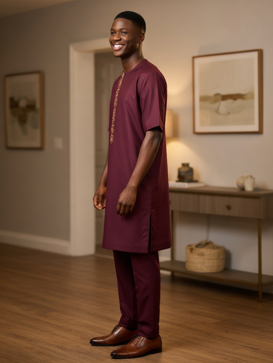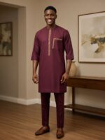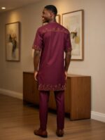 Elevate your wardrobe with this refined maroon kaftan ensemble, tailored for timeless elegance. The long-sleeved tunic is adorned with intricate gold embroidery along the neckline and chest pocket, creating a striking contrast against the deep maroon fabric. Paired with matching trousers, the set offers a cohesive and distinguished look. Finished with a modern cut and complemented by brown leather shoes, this outfit seamlessly blends cultural tradition with contemporary sophistication. Perfect for formal occasions, festive celebrations, or stylish everyday wear.