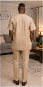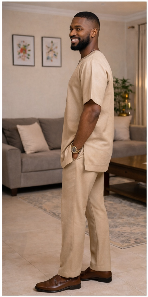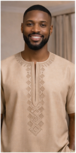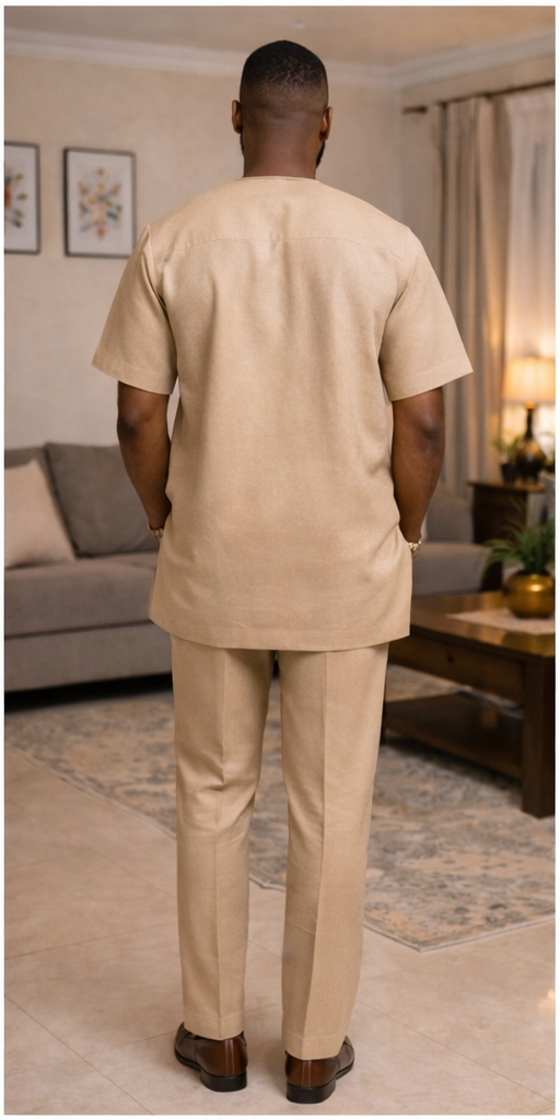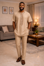 The Sahara Crest Danshiki brings modern African elegance into a soft neutral color story. Its controlled geometric embroidery creates structure around the neckline and down the center front, while the overall cut remains relaxed, masculine, and internationally polished.