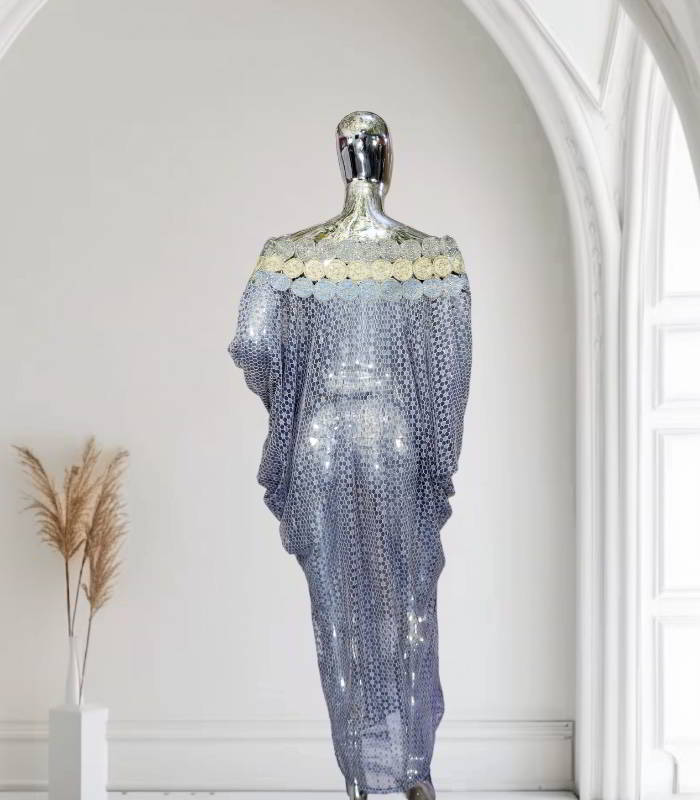 Explore the luxurious HODAN Collection, featuring quality lace fabric and exquisite embroidery details. Each piece, including the off-shoulder boubou kaftan, is adorned with stones for a touch of sophistication. Unlined and designed for the discerning individual, these garments require delicate care and should not be washed in a machine.