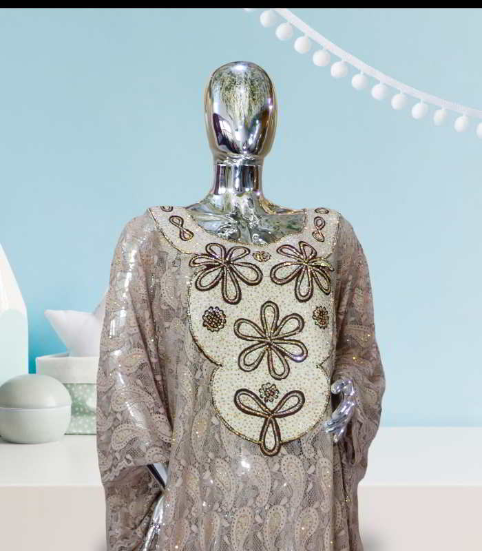 Welcome to the world of luxury and refinement with the OLA Collection, where every garment is a masterpiece of design and craftsmanship. Our garnished with embroidery lace abaya kaftan is a symbol of timeless elegance and modern glamour, perfect for the woman who seeks to make a statement with her style.