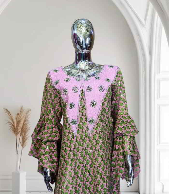 To preserve the delicate craftsmanship and embellishments of these exquisite pieces, please refrain from washing them in a machine. Handle with care and follow the provided care instructions to ensure that your ERI Collection kaftans retain their beauty and allure for years to come.