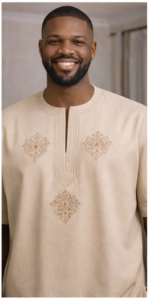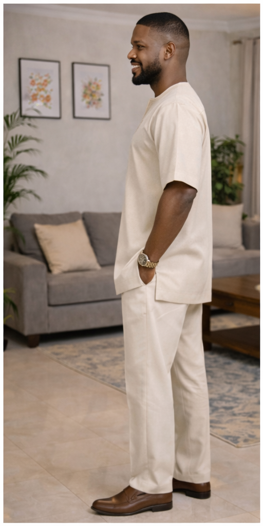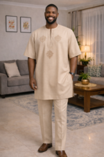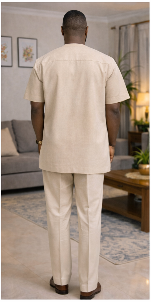 The Champagne Crest Danshiki blends warmth, softness, and executive polish. Its carefully placed motifs introduce traditional character without crowding the garment, and the clean silhouette ensures the outfit feels premium, mature, and suitable for ceremonies, social events, and stylish formal gatherings