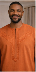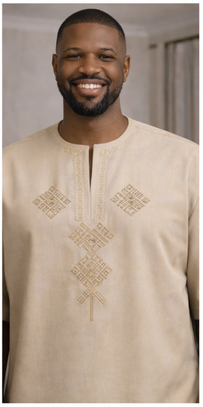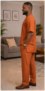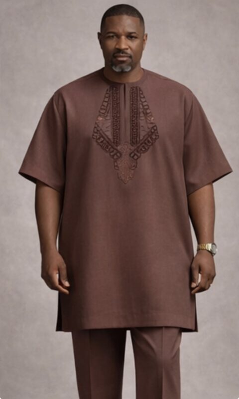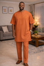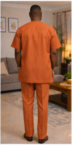 The Amber Chevron Danshiki is crafted for mature men who prefer strong style delivered with discipline and polish. Its chevron yoke panel introduces a deliberate visual identity across the chest while the controlled sleeve length, matching tailored trousers, and premium senator construction keep the outfit sophisticated, wearable, and suitable for executive social dressing.