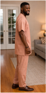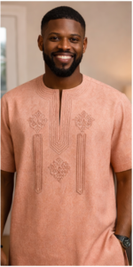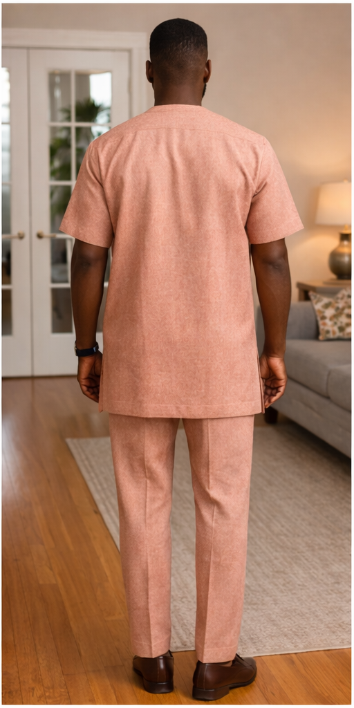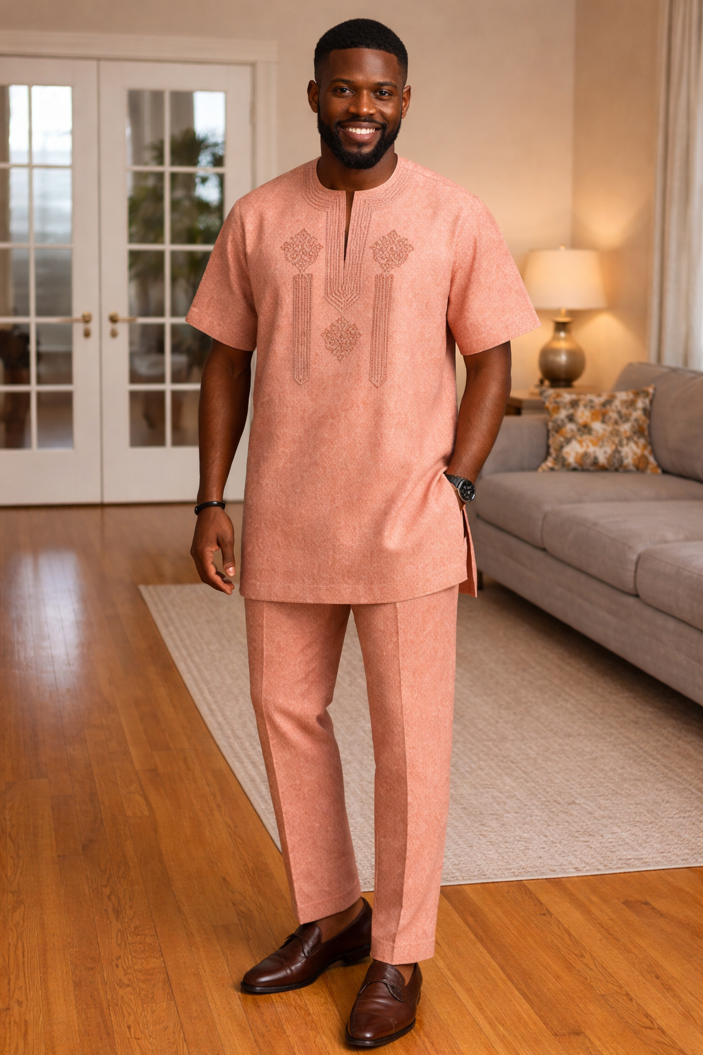 The Blush Regent Danshiki pairs warm color with structured decorative placement to create an outfit that feels modern, composed, and expensive. Its chest motifs and neat neckline pathway give the garment visual identity while keeping the silhouette clean, making it ideal for men who want standout elegance in a tasteful form