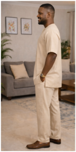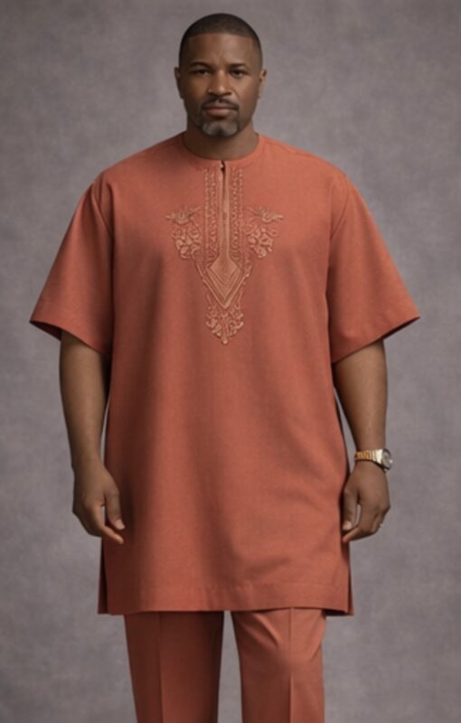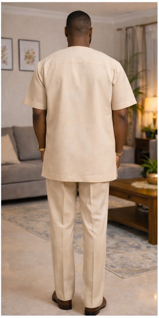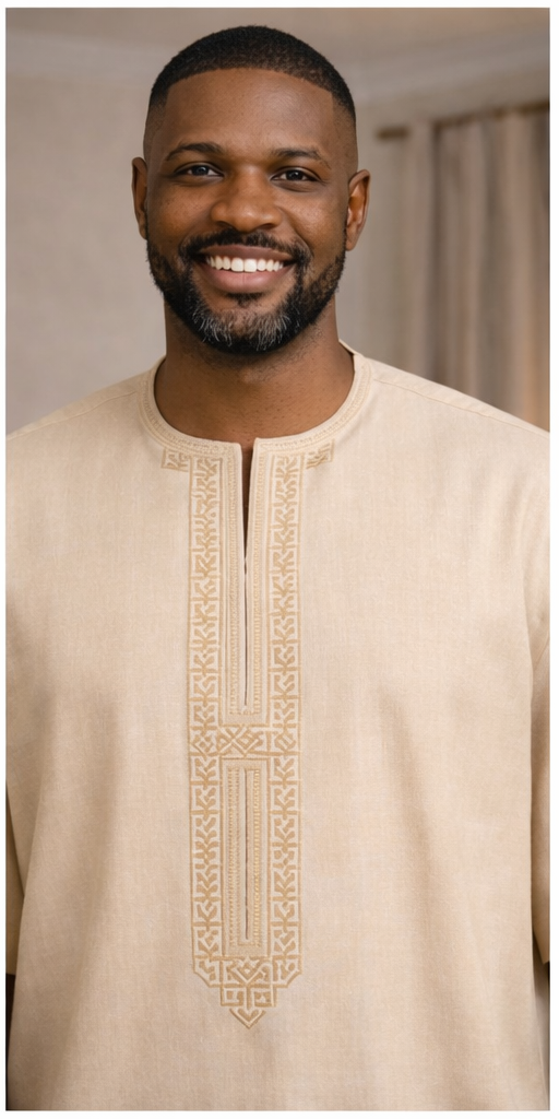 The Desert Laurel Danshiki continues the collection with a tailored silhouette, premium senator, and a soft laurel neckline panel that gives the front of the tunic measured visual interest. Built around the locked sleeve proportion and clean trouser line used throughout the series, it offers a mature luxury option for stylish men who want African menswear that feels modern, disciplined, and event-ready.