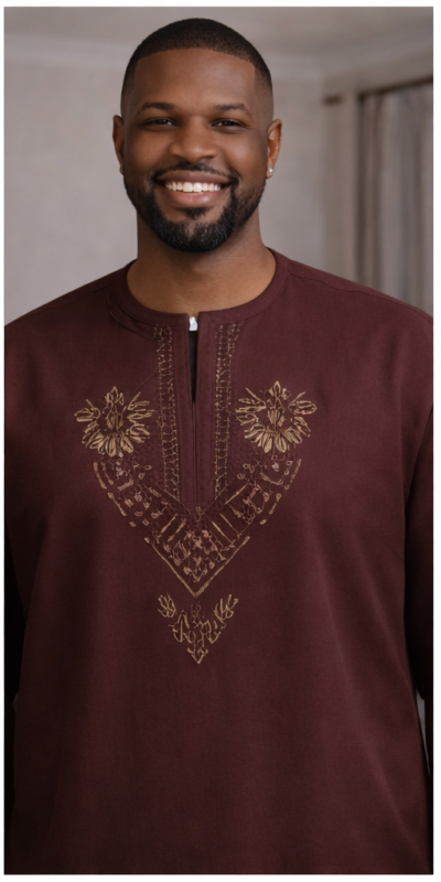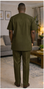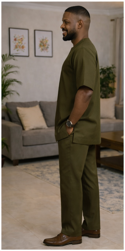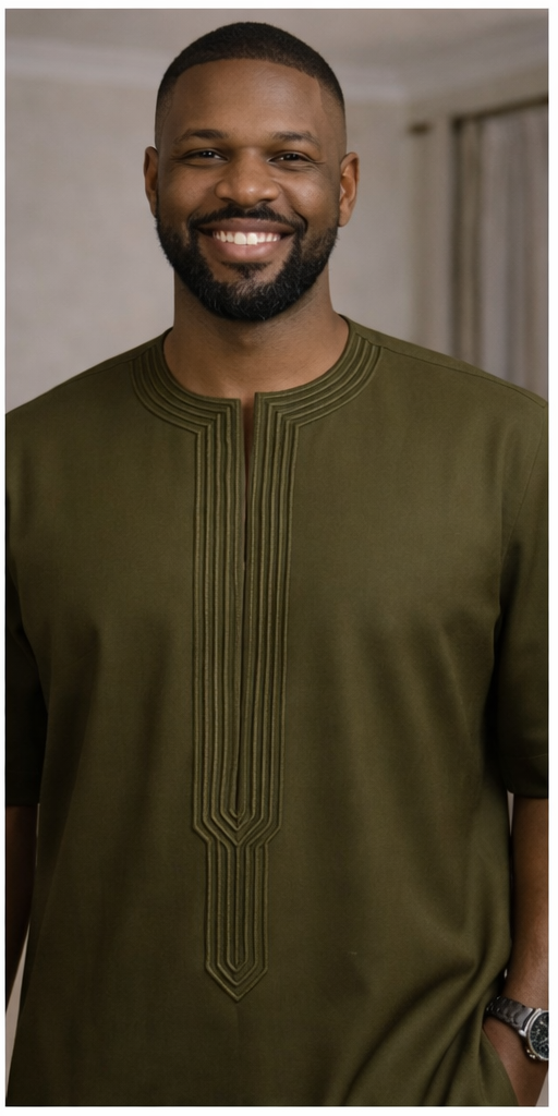 The Verdant Line Danshiki is intentionally restrained, using tonal stitched detailing to create quiet sophistication across the front of the tunic. The rich olive tone, easy sleeve drop, and polished trouser finish give it a calm authority suited to mature men, premium day events, and refined cultural appearances