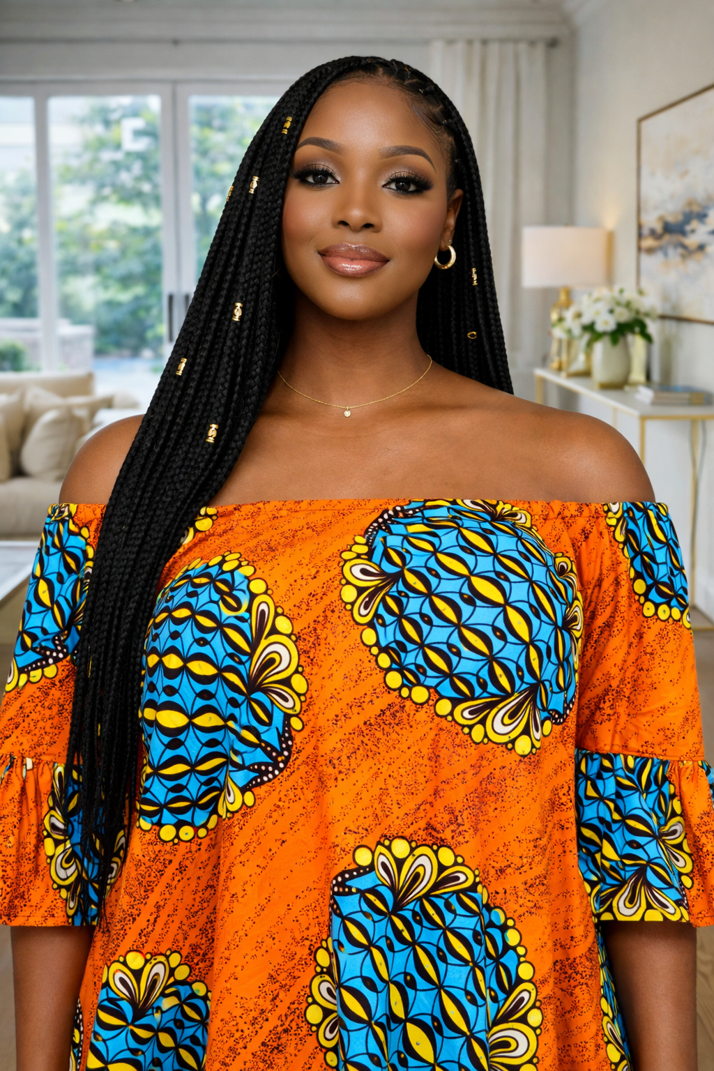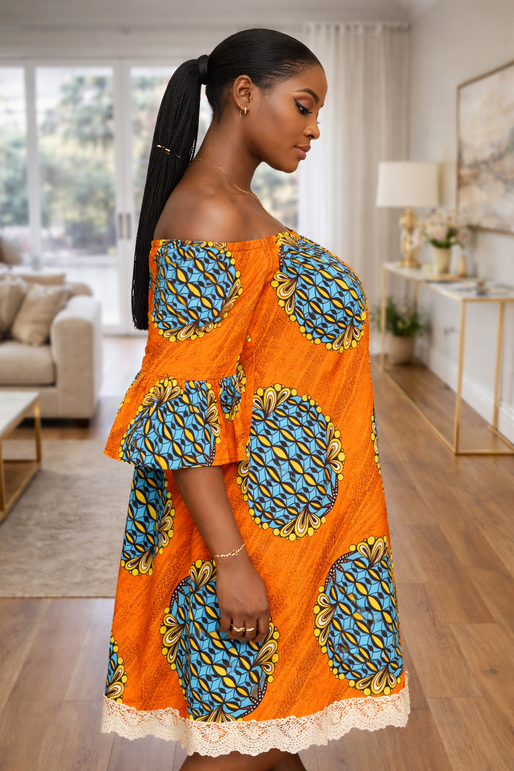 Introducing the EBUN Collection Off-Shoulder Ankara Dress, a masterpiece of design and craftsmanship that embodies the essence of African fashion and heritage. Made for the discerning individual who appreciates the beauty of traditional Ankara fabric combined with contemporary styling, this dress is a true work of art.