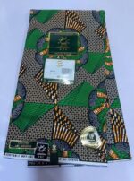 This is a high quality cotton wax fabric with striking geometric patterns in green, black, gold, and white. Bold, durable, and colourfast—ideal for traditional outfits, modern fashion, and accessories.