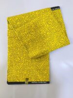 This is a yellow fabric featuring a fine scatter of small black dot-like motifs across the entire surface. The material has a smooth wax-print finish, giving it a bright, clean look suitable for dresses, shirts, accessories, and other stylish creations.