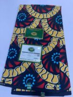 This fabric features a bold, vibrant African wax print design with swirling red and yellow motifs set against a dark background. The material has a smooth, high-quality finish, making it ideal for stylish garments and statement pieces.